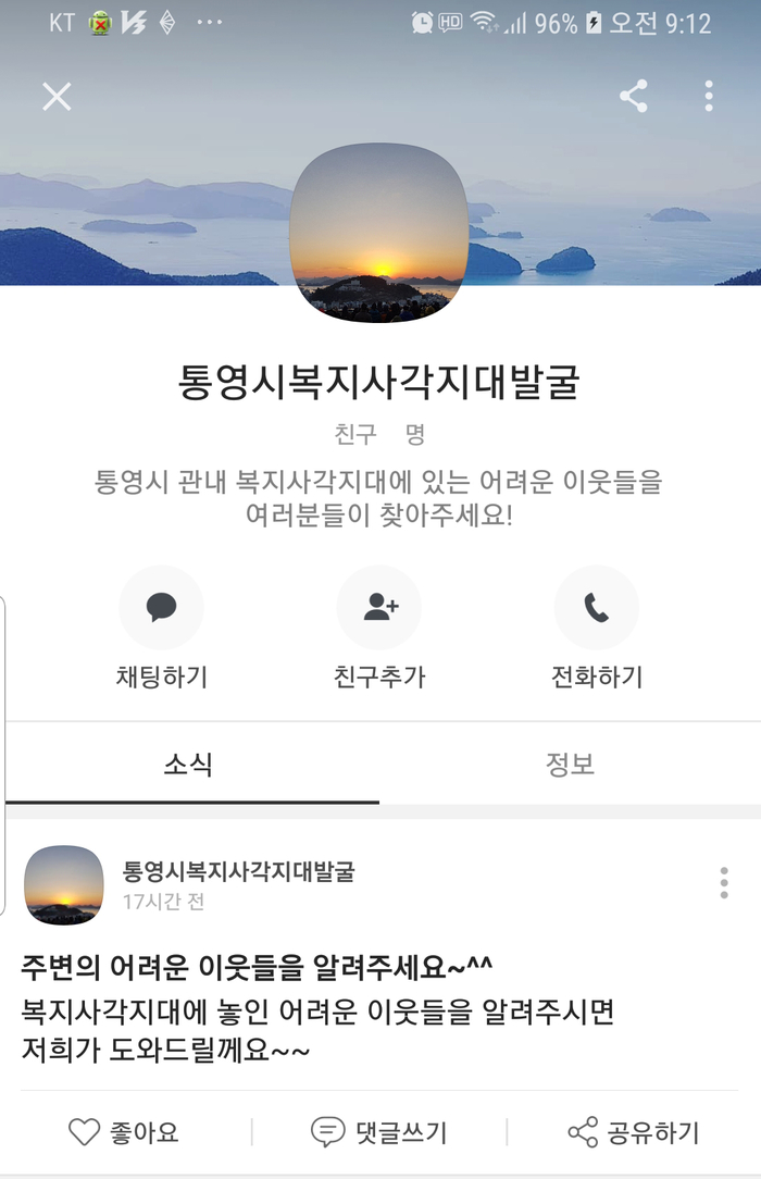 경남 통영시는 복지사각지대 발굴을 위해 시 홈페이지에 신고게시판과 SNS 카카오톡 플러스친구 창구를 개설했다고 29일 밝혔다.