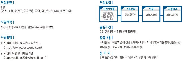 선발된 단원들은 포스코건설이 진출한 해외현장 인근 지역에서 한국 문화 체험 교육과 문화 교류 축제 같은 해외 봉사활동과 화재 예방 주거환경 개선활동, 중학생 대상 자유학년제 건설교육아카데미 등 국내 봉사활동에 참여하게 된다. 모집 분야는 ▲K-POP 보컬·댄스 ▲한국무용 ▲태권도 ▲국악 ▲영상·사진촬영 ▲MC(아나운서) ▲태권도 ▲악기 ▲IT(3D프린터·드론)이고, 모집 인원은 총 32명이다.