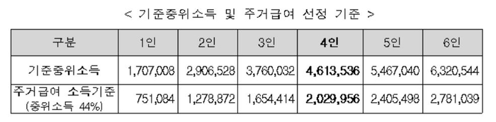 지원대상은 신청가구의 소득 및 재산을 종합적으로 반영한 소득인정금액이 기준 중위소득의 44% 이하(4인 기준 약 203만원)에 해당하는 가구다. 소득인정금액에 부양의무자의 소득, 재산 유무는 고려하지 않는다.