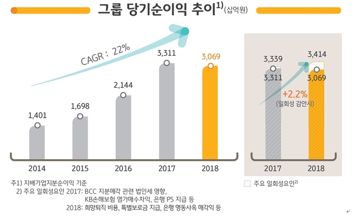 여기에 BCC 지분매각 관련 이연법인세 영향(1583억원)과 KB손해보험 염가매수차익 등 지분인수 관련 영향(1407억원), 올해 희망퇴직 비용(세후 2153억원), 은행명동사옥 매각익(세후 834억원), 특별보로금(세후 1341억원) 등 일효성 요인도 실적 감소에 영향을 미쳤다. 다만 일회성 영향을 제외한 경상 실적은 전년 대비 약 2.2% 증가했다.