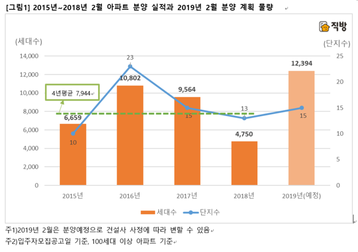 11일 부동산정보서비스 직방에 따르면 2월 전국에서 15개 단지, 총 1만4680세대 중 1만2394세대가 일반분양을 준비하고 있다. 2015년부터 2018년까지의 2월 분양물량은 평균 15개 단지, 7944세대가 공급되었다. 올 2월에 공급하는 아파트 단지 수는 15개로 예년과 비슷하다. 다만 1000세대 이상 대단지 아파트 분양이 많아 분양세대수는 4년 평균보다 많을 것으로 예상된다.