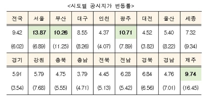 표준지 공시지가는 최근 지가가 크게 상승하고 공시지가가 저평가됐던 토지가 집중된 서울․부산․광주․제주의 공시지가 변동률이 전국 평균 이상으로 올랐으며 나머지 시․도는 전국 평균 미만 상승했다.