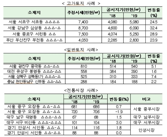 이번 표준지공시지가는 유형과 지역, 가격대별 불형평성을 개선하기 위해 추진됐다. 특히 최근 가격이 급등했거나 상대적으로 시세와 격차가 컸던 가격대의 토지를 중심으로 현실화율이 개선됐다. 이에 중심상업지나 대형 상업·업무용 건물 등 고가토지(전체의 0.4%)를 중심으로 공시가격 변동률이 높게 나타났다. 고가토지는 추정시세가 1㎡당 2000만원 이상인 것으로 전체 토지의 0.4%를 차지한다. 이들의 변동률은 20.05%이며 일반토지는 변동률이 7.29%에 그쳤다.