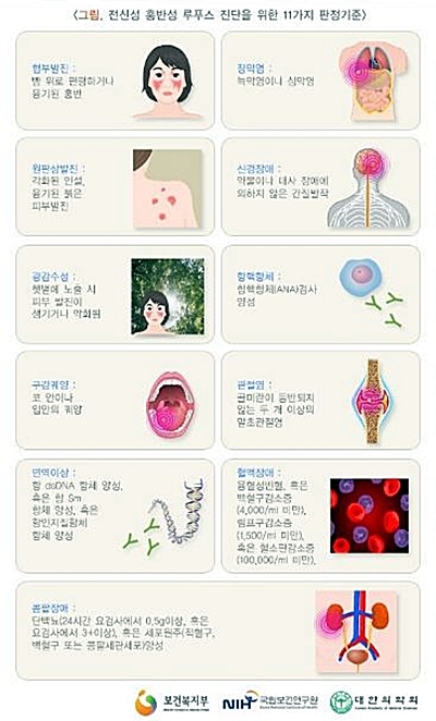 서울대병원은 “전신 장기를 침범하지 않고 피부만 침범하는 피부 루푸스와 같은 가벼운 증상부터 생명을 위협하는 증상까지 다양한 형태로 나타난다”며 “관절통의 경우 75% 이상의 루푸스 환자에게서 나타나며 신부전이나 신증후군 등도 25~75% 환자에게서 발견된다. 2/3 가량은 신경정신증상도 보인다”고 전했다.