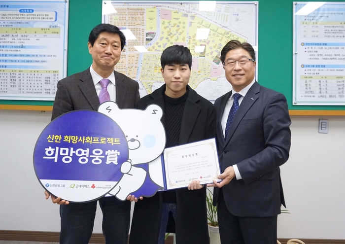 신한금융그룹은 13일 창원시 성산구에 위치한 상남동 행정복지센터에서 지난 1월 무호흡 상태에 빠진 초등학생을 구한 김제훈씨에게 ‘희망영웅상’을 전달했다고 밝혔다.