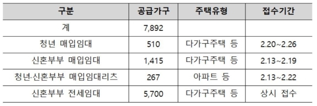 LH는 매입·전세 임대주택 7892가구의 입주자를 모집한다고 13일 밝혔다. 매입임대주택 2192가구는 이날부터 유형별로 입주자 모집을 시작하고, 전세 임대주택 5700가구는 연중 상시 접수한다.