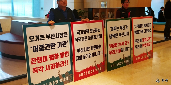 따라서 양대 노조는 “부산시의 부당한 출연 요구를 국민의 혈세를 강탈하려는 시도로 규정하며, 공공서비스를 책임지는 공공기관 노동자로서 절대 수용할 수 없음을 분명히 밝힌다”면서 “앞으로 금융노동자 공동투쟁본부는 부산시의 혈세 강탈 시도를 막아내기 위해 총력투쟁할 것”이라고 강조했다.