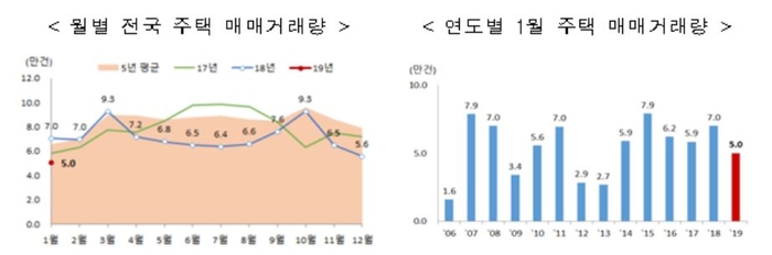 지난 1월 전국 주택매매 거래량은 5만286건으로 지난해 같은 기간(7만354건)보다 28.5% 감소한 것으로 집계됐다. 5년 평균(6만5950건)에 비해서도 23.8% 줄었다.