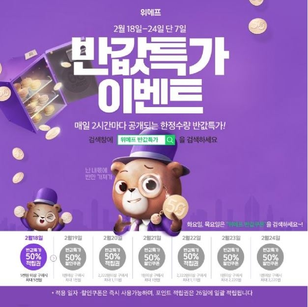 위메프가 타임딜과 포인트적립, 할인쿠콘 증정과 반값 특가 행사를 진행한다.