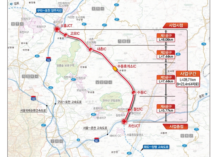 이 중 포스코건설은 포천시 내촌면~남양주시 수동면(수동휴게소 이전) 구간 7.4km, 남양주시 수동면(수동나들목(IC) 이후)~남양주시 화도읍 구간 5.7km를 시공한다.