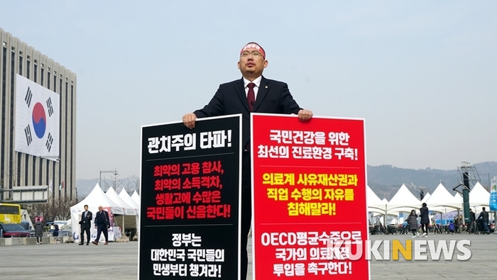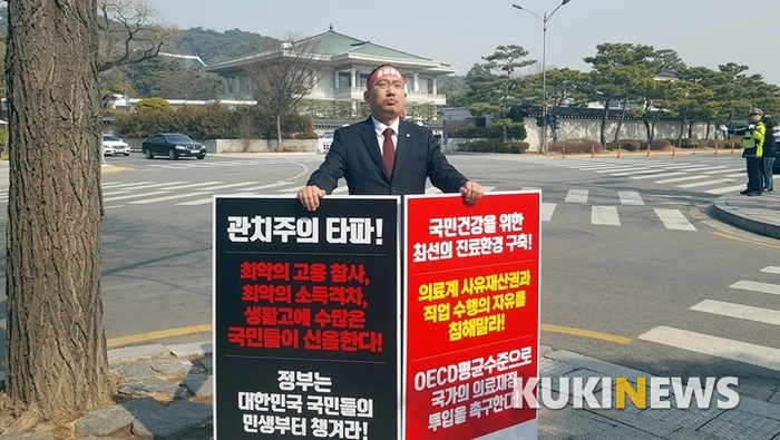 대한의사협회 최대집 회장은 27일 “정부가 나라와 국민을 우선하지 않는다”는 비난의 목소리를 높이며 서울 광화문 광장 세종대왕 동상 앞과 청와대 앞에서 1인 거리시위에 나섰다. 이어 건강을 포함해 국민의 삶이 더 이상 피폐해지지 않도록 연대투쟁에 나설 계획이라고 밝혔다.