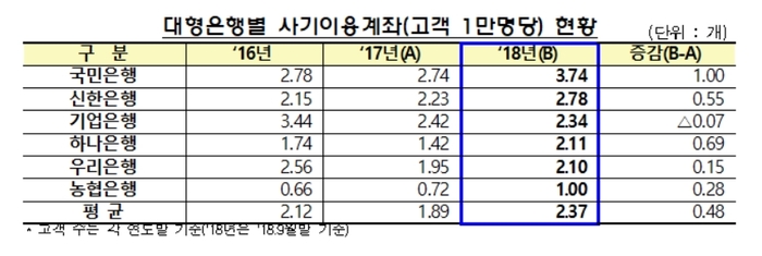 국민은행의 사기이용계좌가 2017년 고객 1만명당 2.74개에서 지난해 3.74개로 가장 많이 증가했으며, 하나은행과 신한은행 역시 각각 0.69개와 0.55개씩 늘어났다.