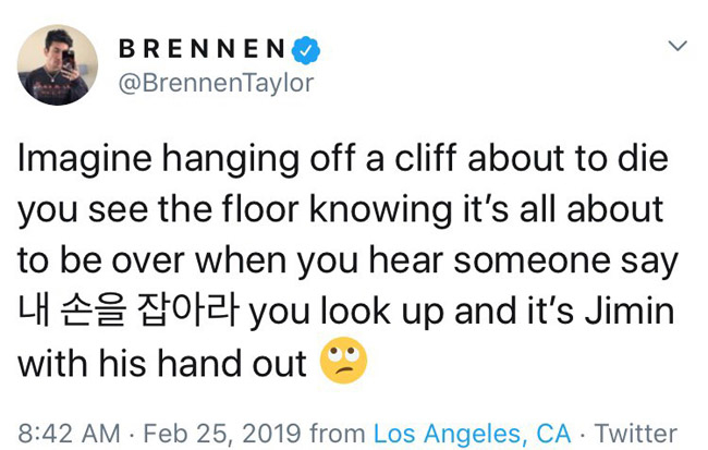 유튜브 구독자 200만명과 트위터 팔로워 68만 3000명을 보유하기도 한 브레넨 테일러는 “절벽 끝에 매달려 죽음을 맞이하는 절박한 순간, 바닥을 내려보며 다 끝났구나 싶을 때 ‘내 손을 잡아라’라는 말이 들려 올려다보면 지민(Jimin)이 손을 내밀고 있을 것이다”라는 글로 뜨거운 반응을 얻고 있다.