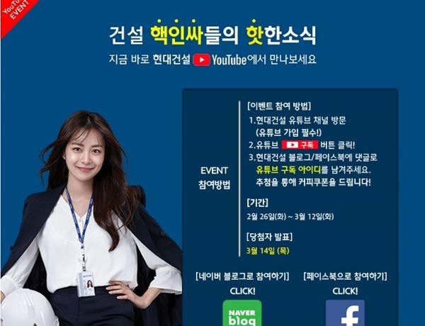 이벤트 참여방법은 현대건설 유튜브 구독 버튼을 누른 뒤 현대건설 블로그와 페이스북에 댓글로 유튜브 구독 아이디를 적으면 된다. 당첨자에게는 커피 쿠폰을 증정한다. 발표는 오는 14일이다.
