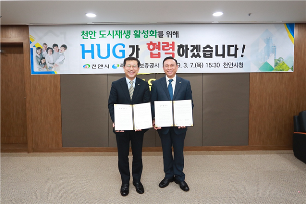주택도시보증공사(HUG)는 지난 7일 천안시청에서 천안시와 도시재생 뉴딜사업의 성공적인 추진을 위한 상호협력 체계를 구축하기 위해 ‘천안시 도시재생 활성화를 위한 업무협약’을 체결했다.
