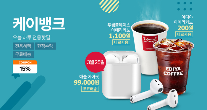 더불어 티몬은 케이뱅크와 연간 마케팅 제휴 협약을 체결하고 3월에도 다양한 이벤트를 진행할 예정이다. 오는 25일에는 케이득딜 프로모션의 일환으로 애플의 무선 이어폰인 에어팟을 9만9000원에 판매할 예정이다. 케이득딜은 케이뱅크 체크카드로만 결제가 가능한 전용 상품으로, 누구나 갖고 싶어하는 인기 상품을 파격적인 할인가로 선보이는 프로모션이다.