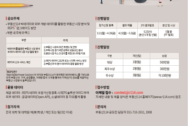 이번 공모전은 빅데이터를 활용한 부동산 시장 분석 부문과 ‘렙스(REPS)'의 신규 서비스 제안 부문 등 2개 분야로 나눠 진행된다. 렙스는 부동산114가 축적한 데이터베이스를 기반으로 전국 부동산의 공급 및 가격 시계열 통계 등을 제공하는 부동산 시장 분석 솔루션이다.