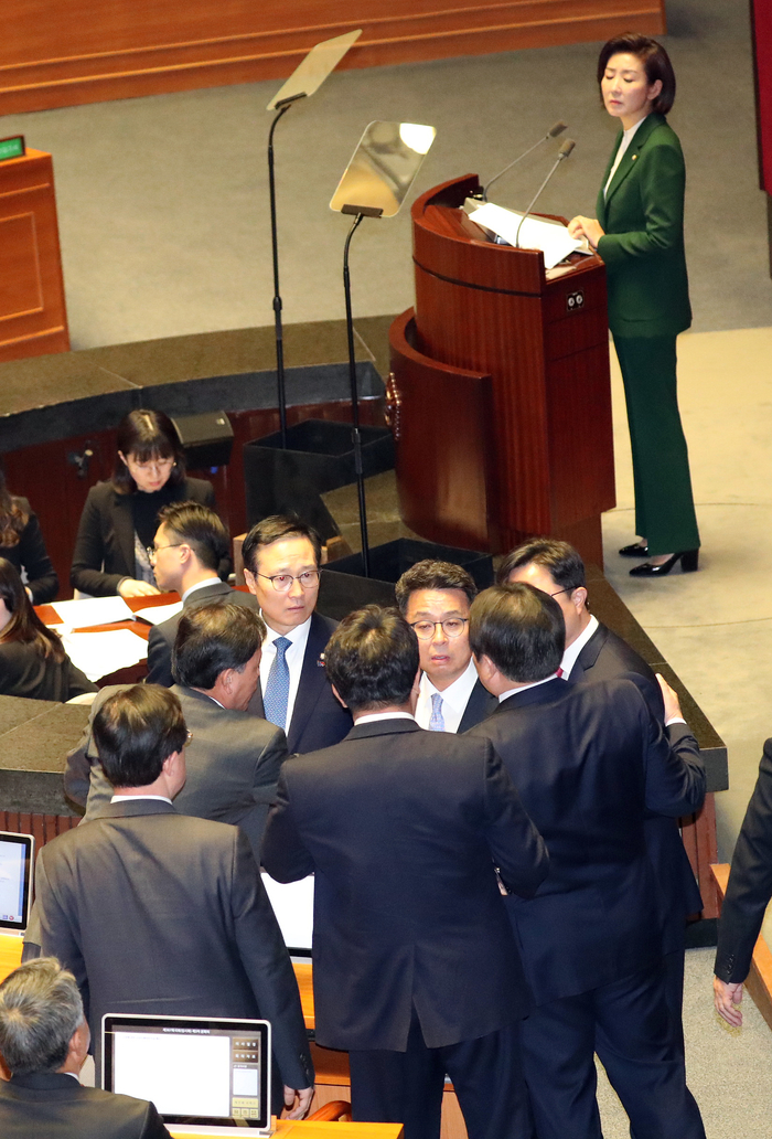 12일 오전 국회 본회의장에서 열린 자유한국당 나경원 원내대표 교섭단체 대표연설에서 더불어민주당 홍영표 원내대표 등 민주당 의원들이 나 대표의 발언에 항의하고 있다.