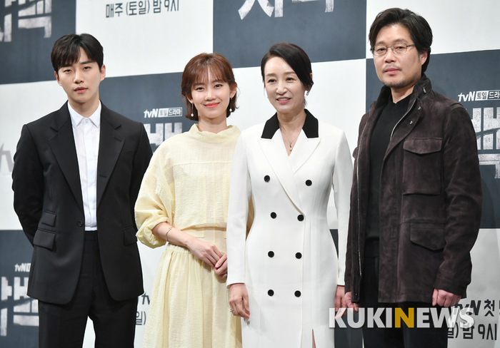 배우 이준호와 신현빈, 남기애, 유재명이 15일 오후 서울 언주로 임피리얼팰리스에서 열린 tvN 새 토일드라마 ‘자백’ 제작발표회에 참석해 포즈를 취하고 있다.