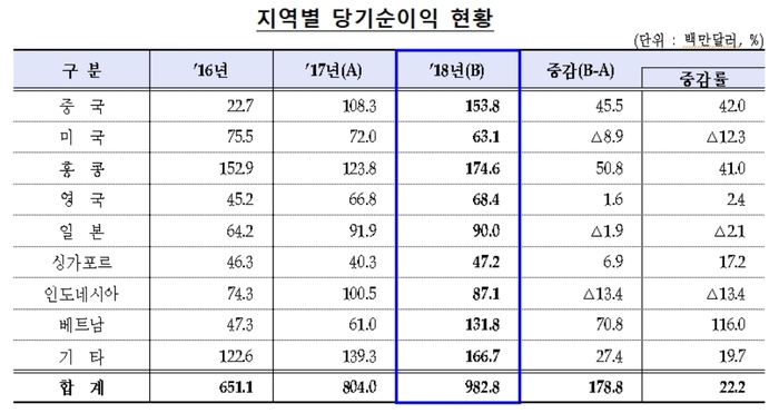 당기순이익은 9억8300만달러로 전년(0.84억달러)에 비해 22.2% 크게 증가했다. 이에 따라 국내은행의 총 당기순이익에서 해외 순익이 차지하는비중도 2017년 7.7%에서 지난해 8.0%까지 늘어났다.