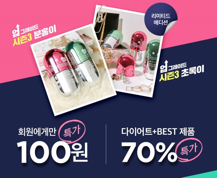 GRN(지알엔) 분홍이초록이 시즌3 리미티드 에디션(한정판)이 출시됐다. GRN은 소비자들의 불편사항과 최신 트렌드를 맞춰 분홍이초록이 시즌3 리미티드 에디션을 선보였으며, 19일 단 하루 해당 분홍이초록이 시즌3 제품을 100원 특가로 구입 가능한 고객감사 이벤트와 다이어트+베스트 제품 70% 할인 이벤트를 함께 진행한다.