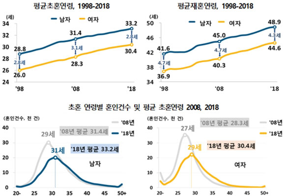 혼인연령의 경우 지난해 남성이 평균 초혼연령 33.2세였고, 여성은 30.4세로 남녀 모두 2017년 보다 0.2세 늘었다. 특히 10년 전과 비교하면 평균 초혼연령이 남성은 1.8세, 여성은 2.1세 상승했다. 남성과 여성의 평균 초혼연령 차이는 2.8세로 2017년 대비 0.1세 늘었다.