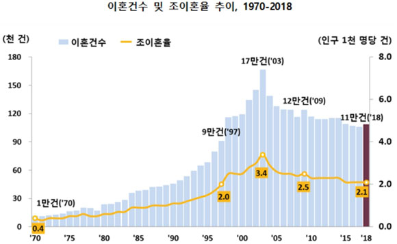 통계청이 20일 발표한 2018년 혼인‧이혼 통계에 따르면 지난해 혼인건수는 25만7600건으로 전년대비 2.6% 감소했고, 이혼건수는 10만8700건으로 전년대비 2.5% 증가했다.