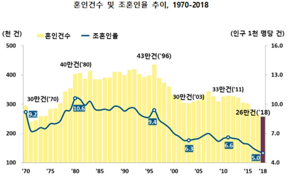 지난해 혼인건수가 25만7600건으로 2017년보다 2.6% 감소한 것으로 나타났다. 이는 지난 2012년 이후 7년 연속 감소한 것으로 10년 전인 2008년 32만7700건 보다 무려 7만100건이 감소했다. 반면 지난해 이혼건수는 10만8700건으로 2017년 보다 2.5% 늘었다.