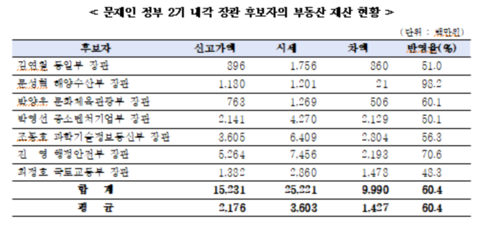 이어 ▲박영선 중기부 50.1%(신고가 21억4100만원, 시세 42억7000만원) ▲김연철 통일부 51.0%(8억9600만원, 17억5600만원) ▲조동호 과기부 56.3%(36억500만원, 64억900만원) ▲박양우 문체부 60.1%(7억6300만원, 12억6900만원) ▲진영 행안부 70.6%(52억6400만원, 74억5600만원) 순이었다. 반영률이 가장 높은 사람은 문성혁 해수부장관 후보였다. 신고가격 11억8000만원, 시세 12억100만원으로 반영률이 98.2%에 달했다.