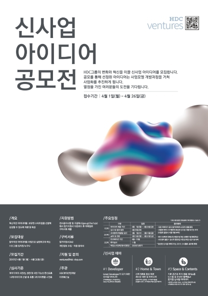 HDC그룹은 디벨로퍼로서 잠재되어있던 직원 개개인의 창의적 아이디어를 발굴하기 위해 오는 4월 1부터 26일까지 신사업 아이디어 공모전을 개최한다. ▲Great Developer가 되기 위한 신사업 아이디어 ▲신(新)주거문화 형성을 위한 새로운 아이디어 ▲기존 공간 및 주거서비스를 디지털 및 온라인 플랫폼과 연계한 신사업 아이디어 등 3가지 주제로 개최되는 이번 공모전은 HDC현대산업개발이 주관하며, HDC그룹의 모든 계열사 임직원이 참여할 수 있다.