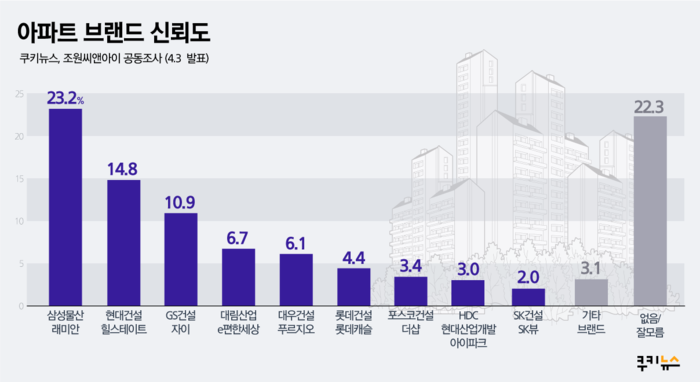 쿠키뉴스와 조원씨앤아이가 공동으로 지난 3월30일~4월1일 사흘간 전국 성인남녀 1000명을 대상으로 국토교통부가 발표한 시공능력평가 상위 10개 건설사들의 ‘아파트 브랜드 신뢰도 조사’ 결과, 응답자 중 23.2%가 삼성물산 래미안을 꼽았다.