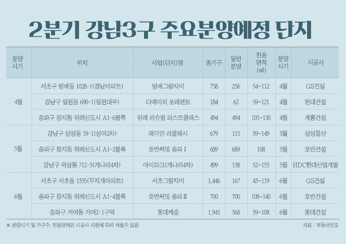 4월~6월 서울 강남3구에서 총 3000여 가구가 일반분양될 예정이다. 이는 지난해 동기보다 약 17배 많은 수준이다.