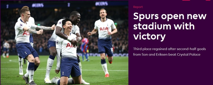 손흥민(토트넘·27)이 토트넘의 신축구장에서 첫 골을 넣으며 잉글리시 프리미어리그(EPL) 공식 홈페이지 메인을 장식했다.