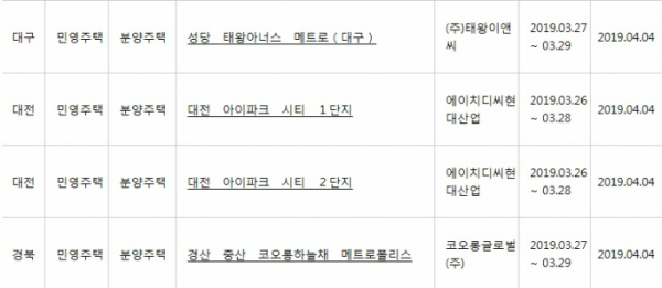 이날 청약 당첨 조회가 가능한 단지는 ‘대구 성당 태왕아너스 메트로’, ‘대전 아이파크 시티 1단지’, ‘대전 아이파크 시티 2단지’, ‘경산 중산 코오롱하늘채 메트로폴리스’ 등 4곳이다.
