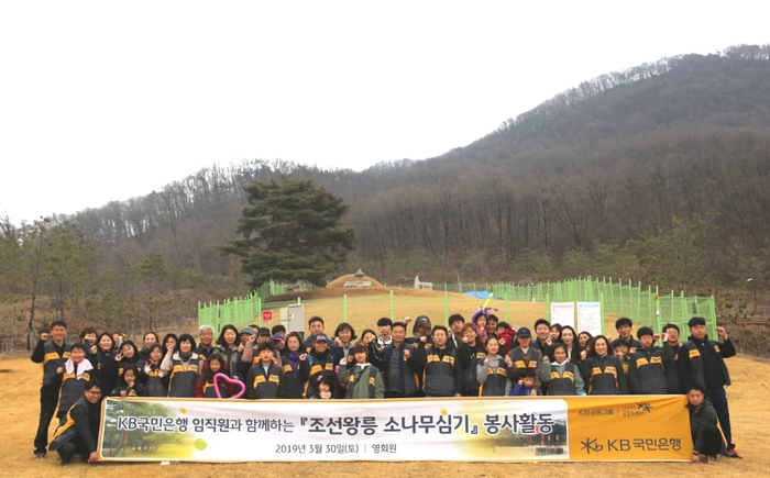 KB국민은행은 지난 달 30일, 제74회 식목일을 기념해 광명시 소재 영회원에서 ‘조선왕릉 소나무 심기’ 봉사활동을 실시했다고 밝혔다. 이날 봉사활동에는 KB국민은행 임직원 및 직원 가족 70여명이 참여했으며, 조선왕릉에 소나무를 심고 주변 환경을 정비하는 등의 문화재 보호활동을 펼쳤다.