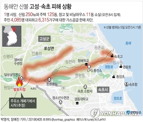 전날인 4일 오후 7시17분 강원 고성군 토성면에서 발생한 화재가 속초 시내로 확산됐다. 5일 오전 7시30분 1명이 숨지고 산림 약 250ha, 주택 125채가 소실됐다.