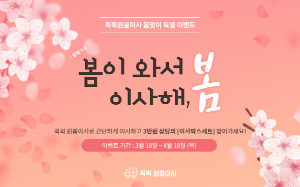 퀵퀵 원룸이사의 ‘봄이 와서 이사해 봄’ 이벤트는 3월 18일부터 4월 18일까지 약 한 달 동안 진행되며, 더욱 자세한 사항은 퀵퀵 원룸이사 웹페이지나 어플을 통해 알아볼 수 있다.
