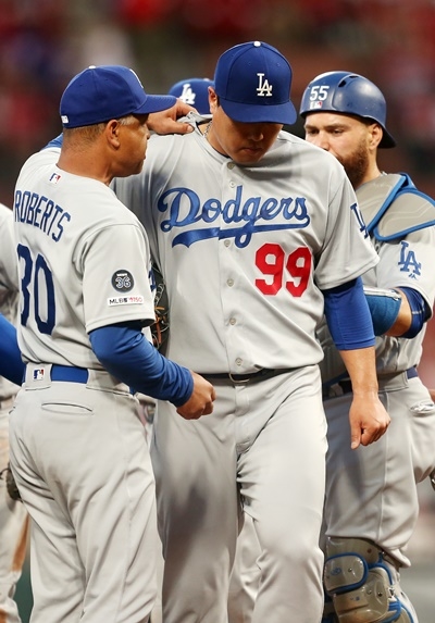LA 다저스 류현진은 9일 미국 미주리주 세인트루이스 부시스타디움에서 열린 ‘2019 메이저리그’ 세인트루이스 카디널스와 원정경기에 선발 등판해 1⅔이닝 2피안타 1탈삼진 2실점을 기록하고 자진해 마운드를 내려왔다. 2회말 갑작스레 찾아온 통증이 문제였다.
