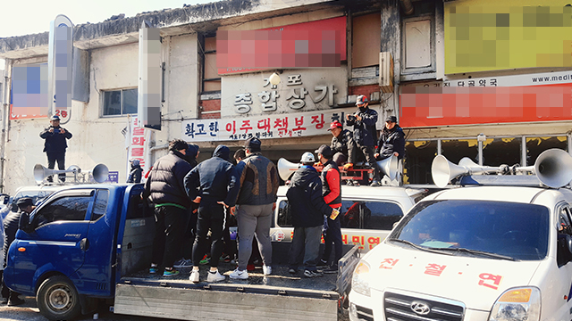 이날 오후 법원 집행관 측은 바닥청소용 살수차를 동원하기도 했다. 이에 따라 집행관들과 상가 세입자 사이 충돌이 빚어지면서 현재까지 14명이 다쳤고, 그 가운데 12명은 병원으로 옮겨졌다.
