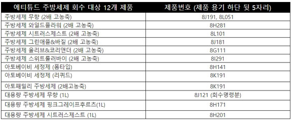 최종 회수 대상 제품은 ▲에티튜드 대용량 주방세제 ▲에티튜드 무향 주방세제 ▲에티튜드 스위트롤러바이 주방세제 등 총 12개 제품의 특정 기간 생산 제품을 포함해 2018년 생산 제품 전체다.