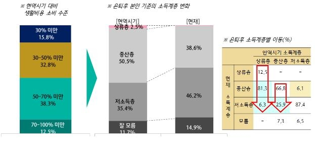 특히 일부 응답자들은 은퇴 후 소득계층이 하락했다는 답변을 내놓았다. 현역시기 상류층이라고 인식했던 은퇴자의 81.3%가 중산층으로, 6.3%가 저소득층으로 이동했으며, 중산층은 25.9%가 저소득층으로 이동한 것으로 응답했다.