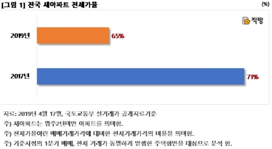 전국의 입주 2년 미만 새 아파트의 매매가 대비 전세가 비율이 60%대로 떨어졌다는 분석 결과가 나왔다. 2017년부터 입주물량이 늘고 있으며, 전셋값이 지난해부터 마이너스 변동률을 나타냈기 때문으로 풀이된다.
