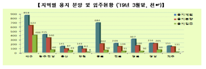 클러스터 용지분양은 197만㎡로 계획(312만4000㎡)대비 63%, 입주는 68만9000㎡로 분양(197만㎡) 대비 35%에 달하며, 혁신도시별로는 광주·전남 3000㎡, 대구 2000㎡ 증가했다.