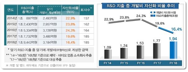 여기에 개발비 자산인식 기준을 구체적으로 공시한 회사의 비중이 2018년 64.7%로 전년보다 14.7%p 증가하는 등 공시수준 또한 향상된 것으로 나타났다.