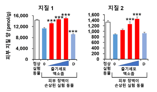 주목할 만한 점은 엑소좀의 경우, 아토피 피부염 치료제로 쓰이는 스테로이드 약물인 덱사메타손(Dexamethasone)과 대등한 수준의 염증개선 개선 효과를 보일 뿐만 아니라, 심각한 체중 감소 등 덱사메타손이 가진 부작용이 전혀 관찰되지 않았다는 점이다. 특히 덱사메타손은 피부 지질 성분을 증가시키지 못하는 반면 줄기세포 엑소좀은 피부 지질을 증가시켜 피부장벽을 개선하는 효과를 확인했다.