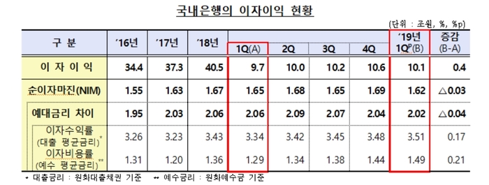 한편 국내 은행의 올해 1분기 이자이익은 10조1000억원으로 예대금리차 축소에도 대출 자산 증가에 따라 늘어난 것으로 나타났다.