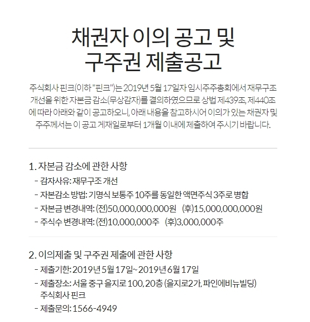 핀크는 이날 임시주주총회를 개최하고 재무구조 개선을 위한 자본금 감소(무상감자)를 결의했다고 공고했다.