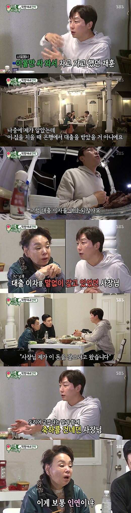 탁재훈은 "그렇게 계약을 하고 3년 반이 흘렀는데 한 번도 잔금 달라는 얘기를 안 하시더라. 나중에 알았는데 은행 이자를 사장님이 혼자 내고 계셨다"고 밝혔다. 그러자 김수미는 "보통 인연이 아니다. 그 분도 옛날에 누군가에게 도움을 받았고, 그걸 너한테 갚는 것"이라고 말했다.