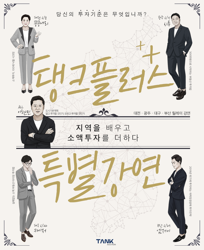 이번 강연은 탱크옥션 이현민 대표가 ‘도시기본계획’을, 각 지역별 초청 연사들이 ‘소액투자’를 주제로 진행된다. 대전은 쿵쿵나리, 광주에 시루, 대구에 카이저, 부산에는 엠제이가 각 4개 도시의 연사로 나선다.