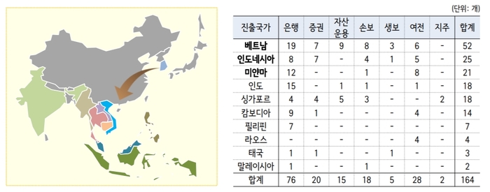 중국(325억달러), 홍콩(179억달러), 영국(115억달러) 등에 진출한 금융기관 점포의 자산도 최소 100억달러를 넘어섰다. 신남방진출 거점으로 작용하는 베트남(78억달러)과 인도네시아(71억달러)의 자산은 80억달러에 못 미쳤다.